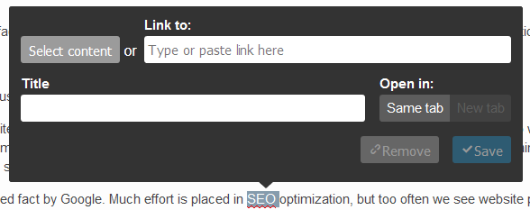 - You can now add links to internal content items in the Online Editor, decide in which tab the link should open, and set link title:
